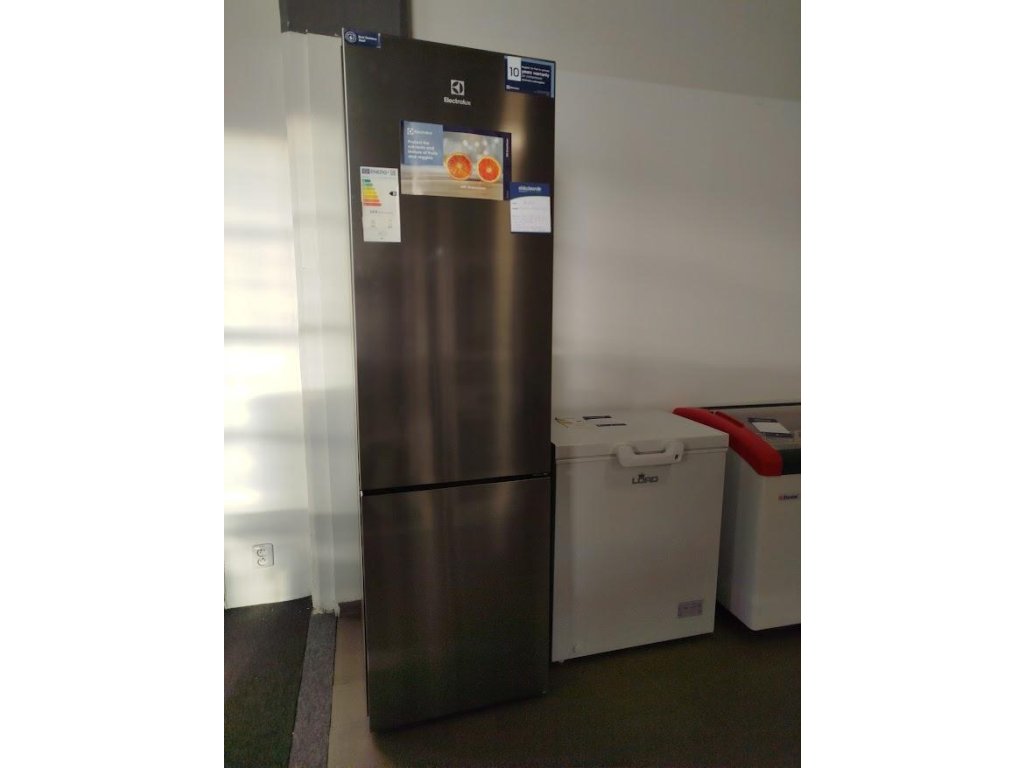 Chladnička kombinovaná s mrazákem dole NF; Electrolux 700 GreenZone+ ENT7MD36X; Výška (cm): 201; Technológia: No Frost; En.třída: D; Čistý objem chladničky/mrazničky (l): 260 / 103; Ovládání: Elektronické, interní; Displej: Ano; Hlučnost (dB): 37; Ventilátor: Metal MultiFlow; Nízkoteplotní zásuvka: ExtraChill; Custom Flex: Ne; Barva: Infinity Brush; Motor: Invertor s 10 letou zárukou; Rozměr VxŠxH (mm): 2020x595x664; Madla: Integrované vertikální